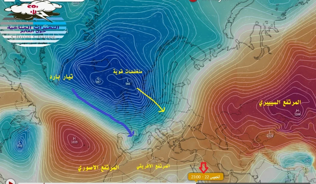 ويشير النموذج الأوروبي إلى نشاط كبير للمنخفضات الأطلسية شمال المحيط وبالقرب من السواحل البريطانية، مع احتمال تسرب هواء بارد قد يؤدي إلى نشوء منخفض منفصل عن المنخفضات الكبيرة، سيؤثر بشكل رئيسي على شمال الجزائر وتونس.