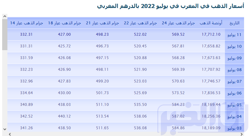 أسعار الذهب اليوم الثلاثاء 12 يوليوز بالدرهم المغربي (MAD)، حيث وصل سعر أونصة الذهب في المغرب هو 17,780.65 درهم مغربي للأوقية، وسعر جرام الذهب هو 571.73 للجرام عيار 24، 524.08 للجرام عيار 22، 500.26 للجرام عيار 21، 428.79 للجرام عيار 18.