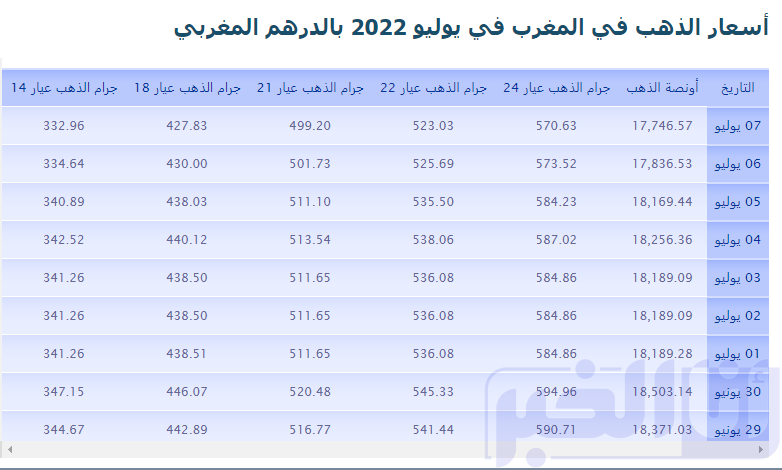 أسعار الذهب اليوم الجمعة 08 يوليوز بالدرهم المغربي (MAD)، حيث وصل سعر أونصة الذهب في المغرب هو 17,718.11 درهم مغربي للأوقية، وسعر جرام الذهب هو 569.71 للجرام عيار 24، 522.24 للجرام عيار 22، 498.50 للجرام عيار 21، 427.29 للجرام عيار 18.