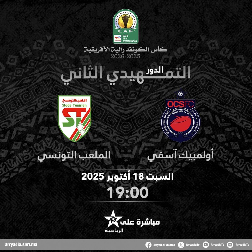 تتجه الأنظار لمواجهة أولمبيك آسفي والملعب التونسي في كأس الكونفدرالية (السبت 18 أكتوبر 2025). اللقاء في آسفي (19:00 بتوقيت المغرب وتونس) وينقل على الرياضية المغربية. يسعى آسفي للاستفادة من الأرض والجمهور، بينما يبحث الملعب التونسي عن نتيجة إيجابية قبل الإياب. يعاني آسفي من غياب لاعبين للإصابة، والمواجهة اختبار لقدرة الفريقين قارياً.