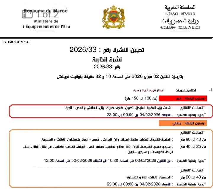 تحيين النشرة الإنذارية رقم 2026/33 يضع شمال غرب المغرب تحت أقصى درجات التأهب يوم الأربعاء 4 فبراير، في سياق موجة جوية واسعة تشمل أوروبا. الالتزام بالنصائح الرسمية والمتابعة اليومية للمديرية العامة للأرصاد الجوية يعد السبيل الأمثل لحماية الأرواح والممتلكات خلال هذه الحالة الجوية الاستثنائية.