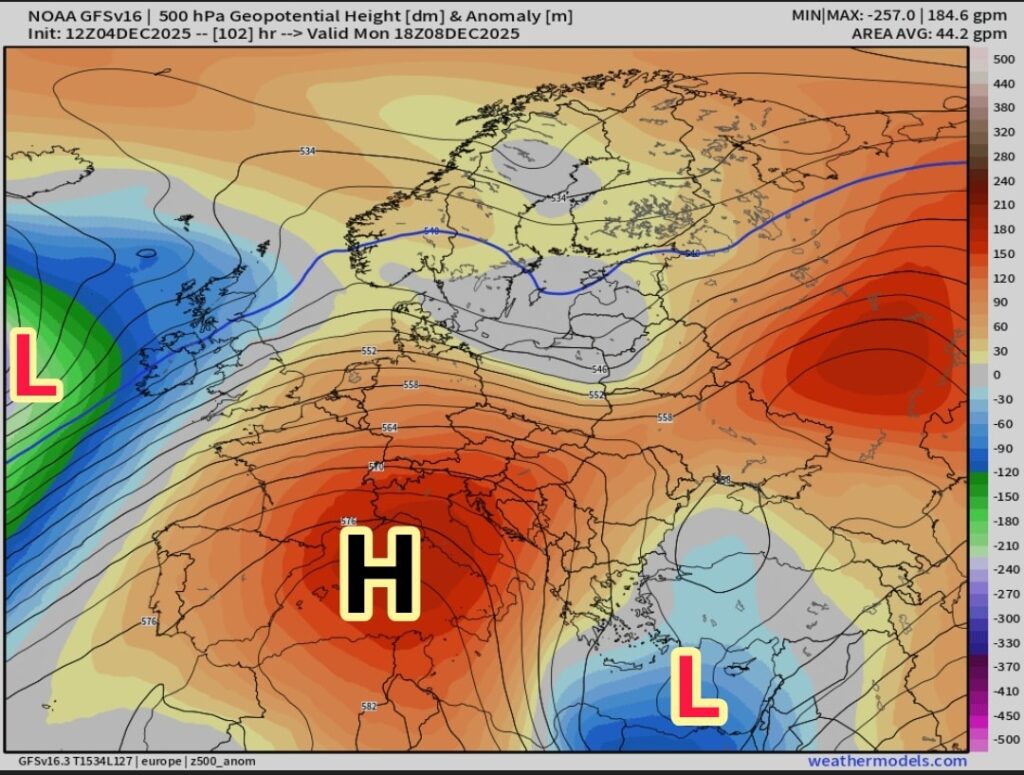 • سيطرة مرتفع جوي: قد يشير وجود القبة الحرارية (التي تظهر كمنطقة دافئة في الخريطة المرفقة، ويرمز لها بالحرف H فوق جنوب أوروبا/شمال إفريقيا ) إلى سيطرة مرتفع جوي يساهم في ارتفاع درجات الحرارة.