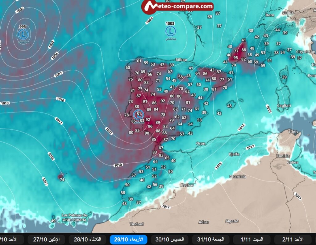 وحسب تطبيق Meteo Compare، تتفاوت فرصة هطول الأمطار بين مناطق المملكة كما يلي: