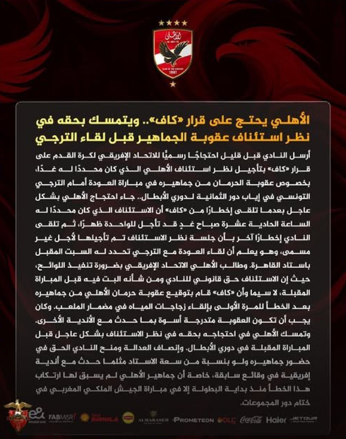 أعلن النادي الأهلي المصري عن تقديم احتجاج رسمي إلى الاتحاد الإفريقي لكرة القدم “الكاف“، اعتراضاً على تأجيل النظر في الاستئناف الخاص بعقوبة حرمان جماهيره من حضور مباراة الإياب أمام الترجي التونسي في دوري أبطال إفريقيا.