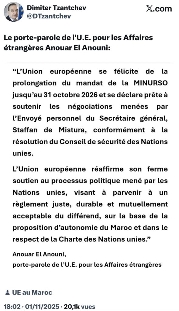 وفي تصريحات رسمية، قال المتحدث باسم الاتحاد الأوروبي للشؤون الخارجية، أنور العنوني، إن الاتحاد الأوروبي يُرحّب بتمديد ولاية بعثة الأمم المتحدة للاستفتاء في الصحراء (المينورسو) حتى 31 أكتوبر 2026، ويُعرب عن استعداده لدعم المفاوضات التي يقودها المبعوث الشخصي للأمين العام للأمم المتحدة، ستافان دي ميستورا، وفقاً لقرار مجلس الأمن الدولي الأخير.