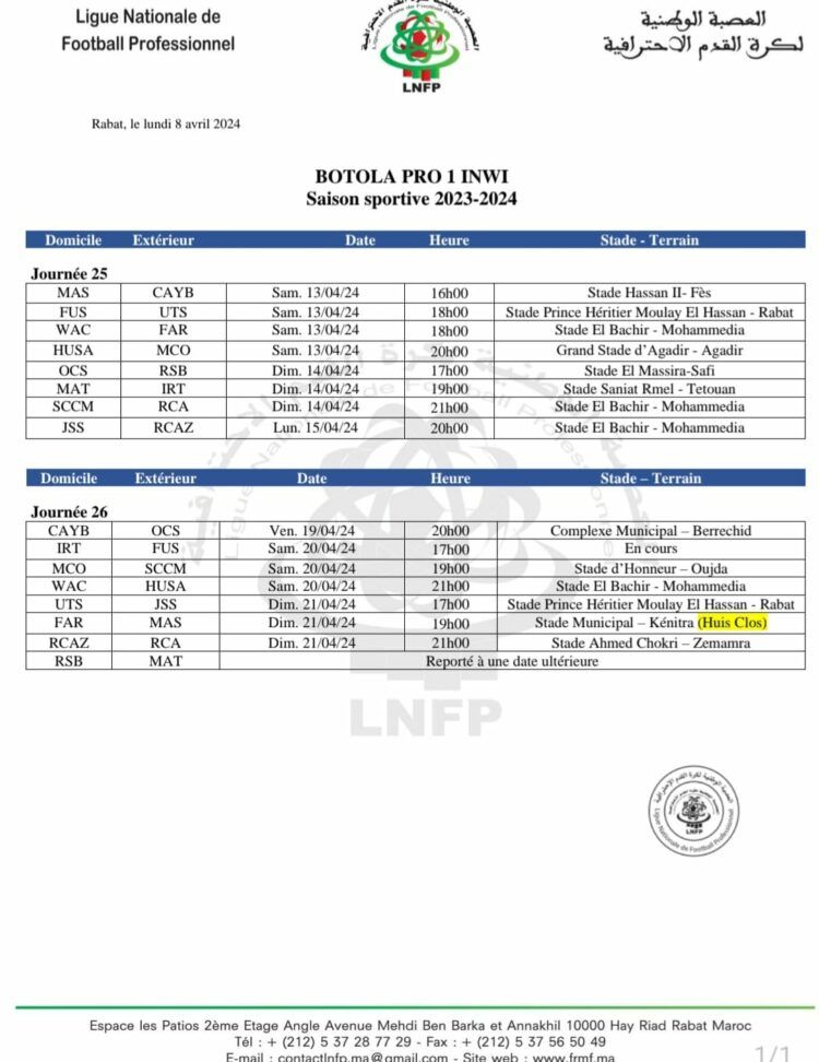كشفت العصبة الاحترافية لكرة القدم عن برنامج الجولتين 25 و26 من البطولة الاحترافية، بعد توقف دام أسبوعين لإتاحة المجال لإجراء مباريات كأس العرش.