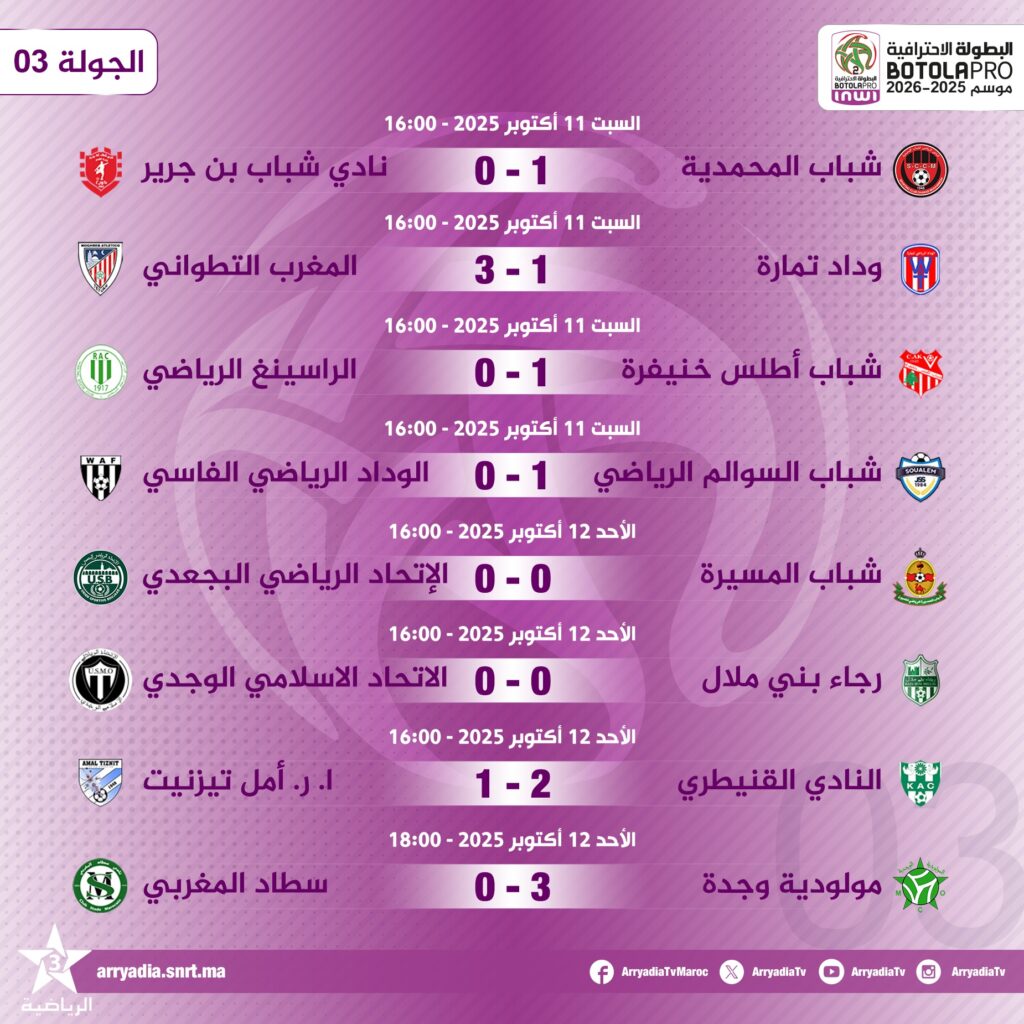 اختُتمت مباريات الجولة الثالثة من البطولة الوطنية الإحترافية “إنوي” للقسم الثاني، التي جرت يومي 11 و12 أكتوبر 2025، وشهدت نتائج مثيرة أبرزها فوز مولودية وجدة بثلاثية وتعادل شباب المسيرة بدون أهداف. إليكم النتائج الكاملة في جدول منظم.