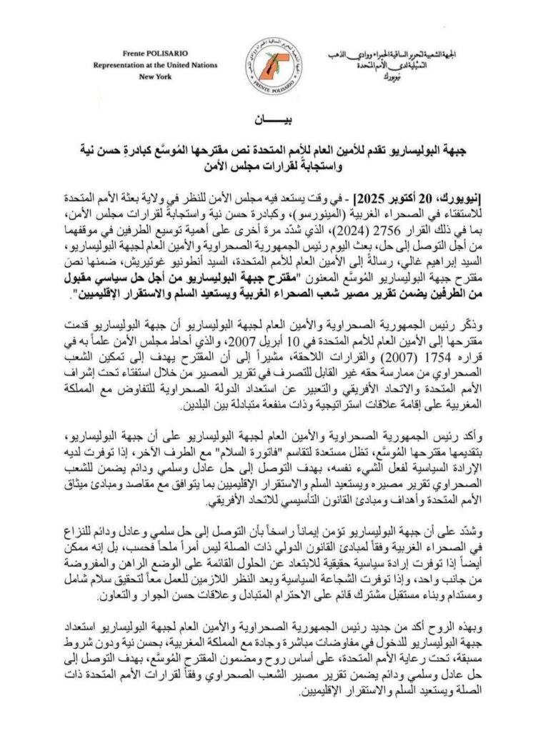 بيان "البوليساريو" الأخير إعلان انكسار يعترف بانتهاء الوهم. الجبهة تتراجع عن خطاب "الكفاح المسلح" و"تقرير المصير" مُبديةً استعدادًا للحوار، في محاولة يائسة للنجاة بعد انهيار "أسطورة التحرير" أمام الدبلوماسية المغربية. العالم يدعم الحكم الذاتي تحت السيادة المغربية، والجزائر تتخلى تدريجيًا. افتتاح القنصليات والاستثمارات التنموية بالمغرب يعزز سيادة المملكة. الصحراء مغربية، و"البوليساريو" في طريق الزوال.