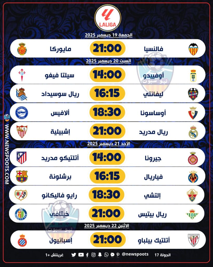 جدول مواجهات الجولة 17 – الدوري الإسباني 2025