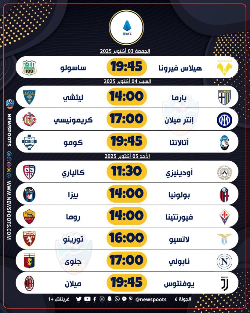 تستعد الجماهير العاشقة لجولة جديدة ومليئة بالإثارة، حيث تتجه الأنظار إلى الجولة السادسة من منافسات الدوري الإيطالي (الكالتشيو) التي تحمل بين طياتها مواجهات كلاسيكية ثقيلة قد ترسم ملامح صراع القمة مبكراً. هذه الجولة ليست مجرد ثلاث نقاط، بل هي اختبار حقيقي لطموحات فرق المقدمة، وعلى رأسها القمة التاريخية بين يوفنتوس وميلان، والامتحان الصعب لـروما في “فلورنسا”، والمهمة السهلة نسبيًا لـإنتر ميلان ونابولي للحفاظ على تواجدهما في الصدارة.