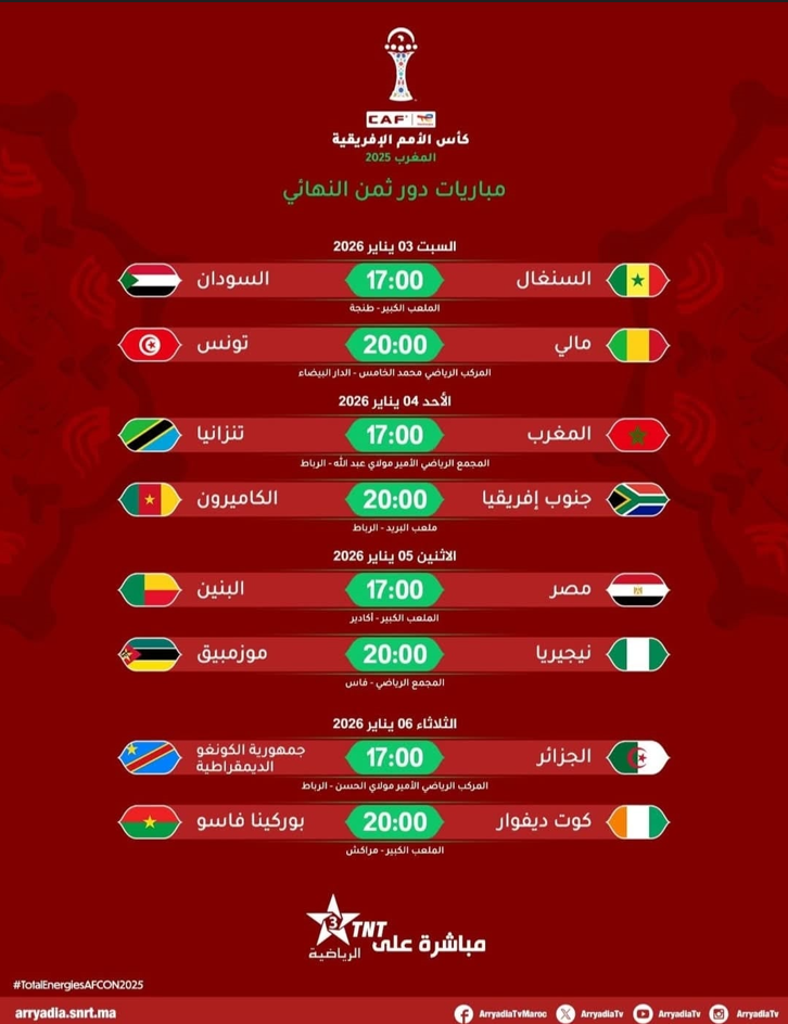 كأس إفريقيا 2025 .. برنامج دور الثمانية كاملا بالصورة: