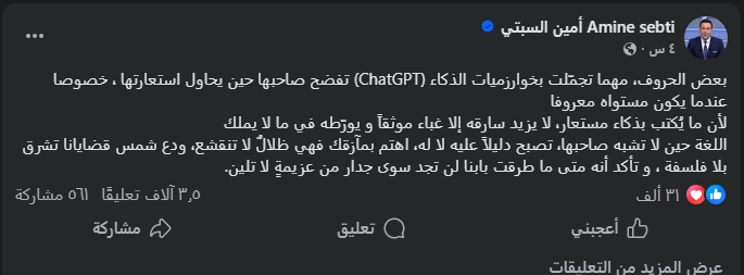 “بعض الحروف، مهما تجمّلت بخوارزميات الذكاء (ChatGPT)، تفضح صاحبها حين يحاول استعارتها، خصوصاً عندما يكون مستواه معروفاً. لأن ما يُكتب بذكاء مستعار، لا يزيد سارقه إلا غباءً موثقاً ويورّطه في ما لا يملك. اللغة حين لا تشبه صاحبها، تصبح دليلاً عليه لا له. اهتم بمآزقك فهي ظلالٌ لا تنقشع، ودع شمس قضايانا تشرق بلا فلسفة، وتأكد أنه متى ما طرقت بابنا لن تجد سوى جدار من عزيمةٍ لا تلين.”