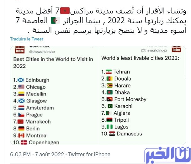 و بالموازاة مع ذلك، يعيد التصنيف المطروح الشرخ و الفرق الكبير و الواضح بين مراكش المغربية و الجزائر العاصمة التي باتت محط سخرية لا نظير لها باحتلالها المرتبة السابعة ضمن أسوء المدن الذي لا ينصح قط بزيارتها.