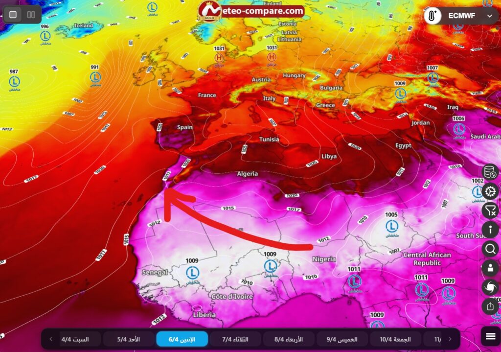تشير آخر بيانات النماذج العددية، وتحديداً النموذج الأوروبي (ECMWF)، إلى تغير جذري في المنظومة الجوية فوق دول شمال إفريقيا بما فيها المغرب، حيث تظهر الصور الجوية بوضوح صعود كتل هوائية حارة وجافة قادمة من عمق الصحراء الكبرى باتجاه أقاليمنا الجنوبية والمناطق الوسطى، وصولاً إلى الشمال.