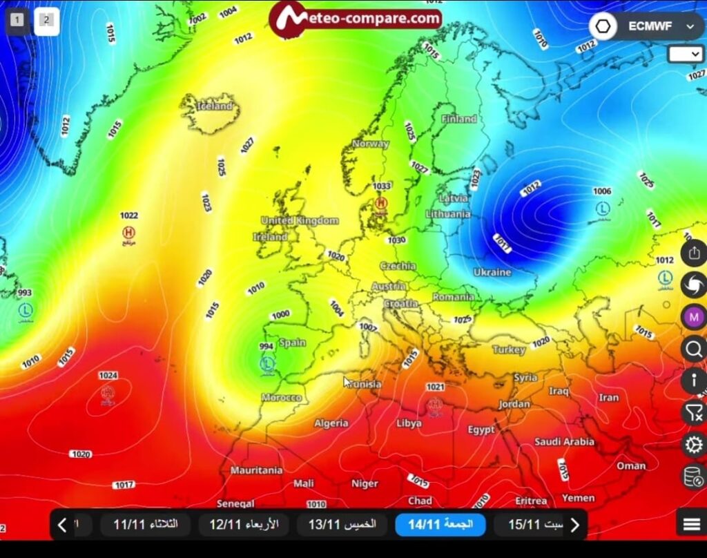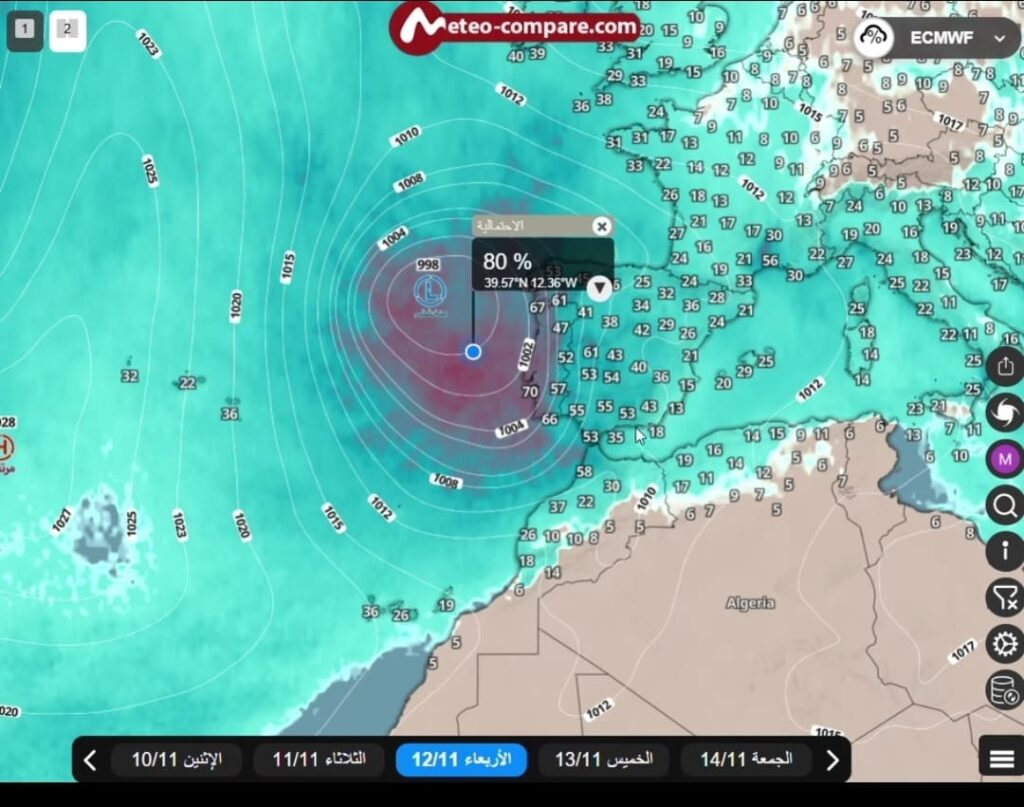 تؤكد النماذج بشدة على قدوم أول منخفض جوي يوم الأربعاء 05 نوفمبر، حيث وصلت احتمالية تحقق هذا السيناريو إلى نسبة عالية جداً تقارب 90%.
