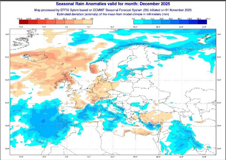 مع اقتراب دخول شهر دجنبر، تتجه أنظار المتابعين إلى التوقعات الجوية الموسمية، خصوصا في ظل حاجة المغرب للأمطار وتحسّن الوضع المائي. وفي هذا السياق، كشف المركز الأوروبي للتوقعات المتوسطة المدى ECMWF عن أولى الإشارات المتعلقة بطقس شهر دجنبر 2025، وهي توقعات أولية تحتاج دائما إلى المتابعة مع اقتراب الفترة.