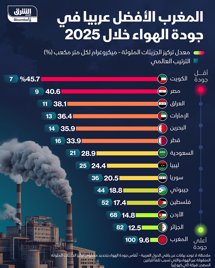 وفقاً للبيانات الصادرة عن شركة “آي كيو إير” (IQAir) ونشرتها “اقتصاد الشرق مع بلومبرغ”، احتل المغرب المرتبة 100 عالمياً (حيث تعكس المراتب المتأخرة في هذا المؤشر جودة هواء أفضل)، مسجلاً معدل تركيز للجزيئات الملوثة بلغ 9.6 ميكروغرام لكل متر مكعب.