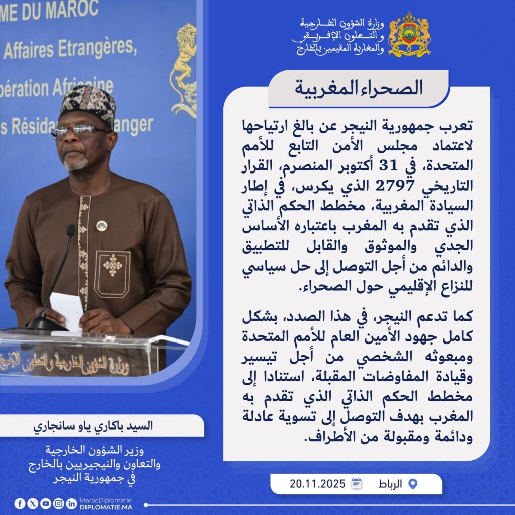 خلال لقاء دبلوماسي رفيع المستوى جرى اليوم الخميس 20 نونبر 2025 بالرباط، لم يتردد وزير خارجية النيجر، باكاري ياو سنغاري، في التعبير عن موقف بلاده الصريح والداعم لسيادة المغرب على صحراءه. وقد جاء هذا الموقف ليؤكد أن قطار الاعترافات الدولية بمغربية الصحراء يسير بسرعة وثبات، تاركاً خلفه كل من لا يزال يراهن على أوهام الانفصال.