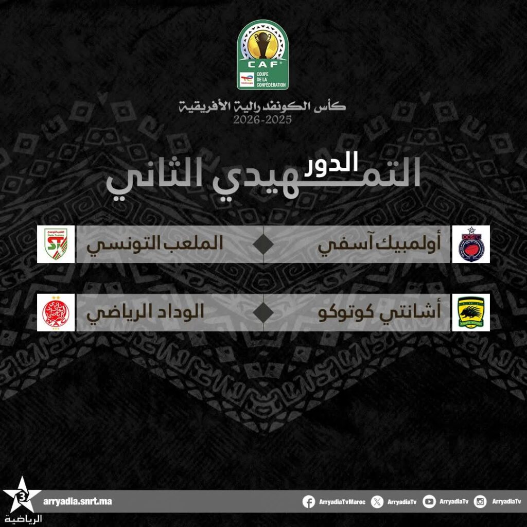 أسفر الدور التمهيدي الثاني من كأس الكونفدرالية الإفريقية 2025-2026، عن مواجهتين قويتين لممثلي الكرة المغربية في المسابقة، الوداد الرياضي وأولمبيك آسفي، في خطوة جديدة ضمن رحلة الأندية المغربية لاستعادة هيبتها القارية.