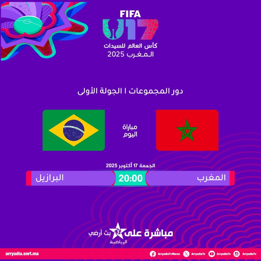 اليوم: المغرب يواجه البرازيل في كأس العالم للسيدات تحت 17 سنة. المباراة تقام على الملعب الأولمبي بالرباط (17 أكتوبر 2025، 20:00). تنقل مباشرة على قناة الرياضية Arryadia. المنتخب المغربي يستهل البطولة بمواجهة قوية، والبرازيل تسعى لتأكيد مكانتها. البطولة تاريخية للمغرب، تهدف لتطوير كرة القدم النسوية.