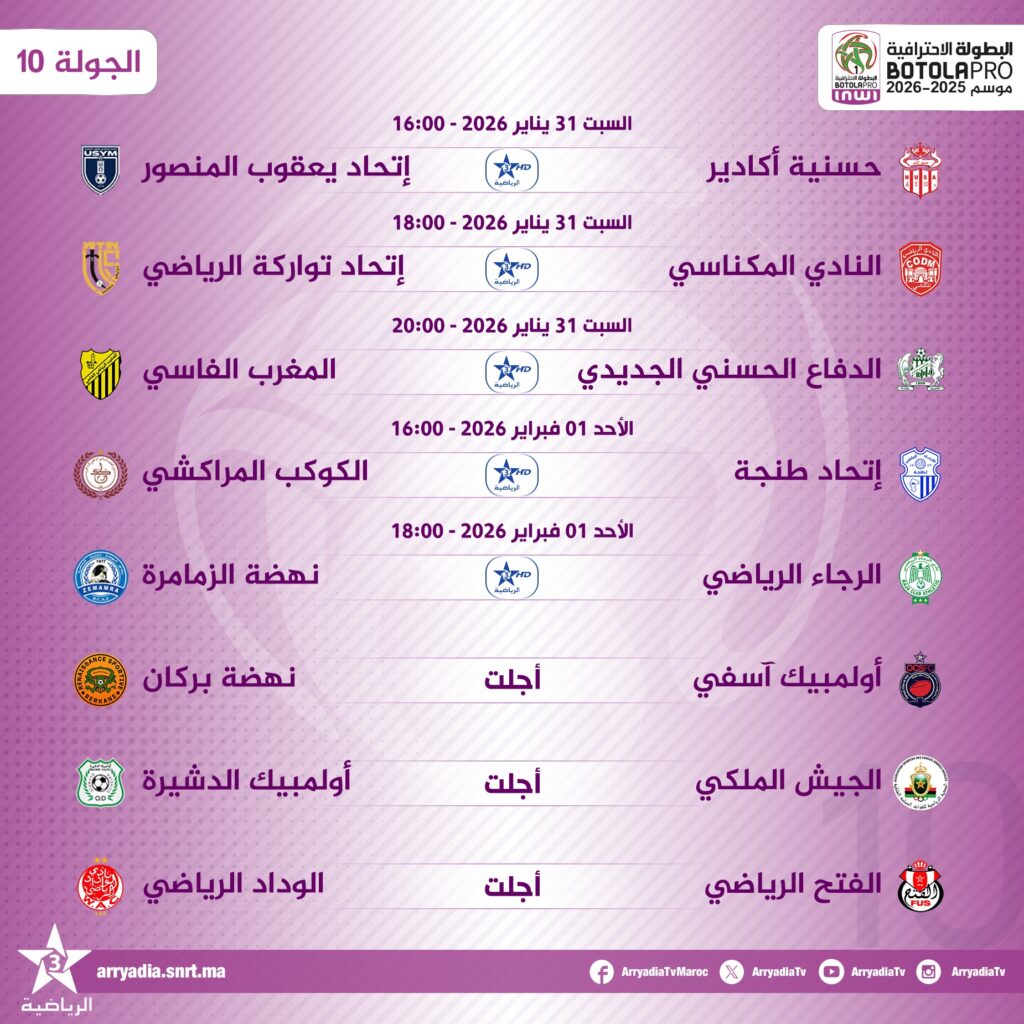 تتجه أنظار عشاق كرة القدم الوطنية نهاية هذا الأسبوع نحو ملاعب البطولة الوطنية “إنوي” (موسم 2025-2026) للقيم الأول، حيث تدخل المسابقة جولتها العاشرة بمباريات واعدة، رغم بتر البرنامج من ثلاث مواجهات قوية تم تأجيلها لفسح المجال للمشاركة القارية للأندية المغربية.