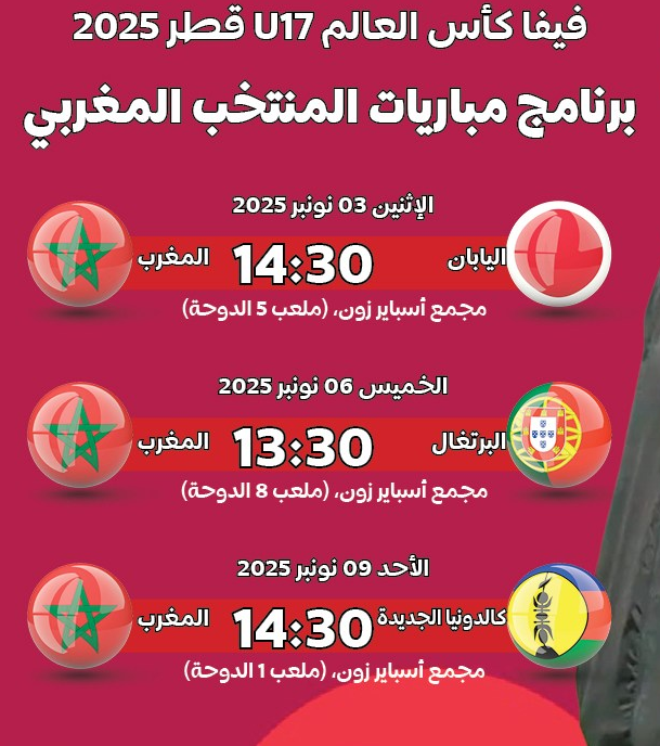 بعثة المنتخب المغربي لأقل من 17 سنة تصل الدوحة استعدادًا لكأس العالم 2025 بقطر (3-27 نونبر). البطولة تشهد مشاركة 48 منتخبًا. المنتخب بطل إفريقيا، وأجرى تجمعًا إعداديًا بالإمارات، خاض خلاله وديتين (تعادل مع فنزويلا، فوز على سويسرا). المباريات ستقام بمجمع أسباير زون واستاد خليفة. برنامج مباريات المغرب: اليابان (3 نونبر)، البرتغال (6 نونبر)، كاليدونيا الجديدة (9 نونبر). اللاعب وزان يؤكد جاهزية الفريق وحماسه للمنافسة.