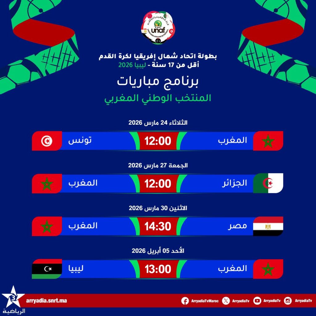 حطت بعثة المنتخب المغربي للناشئين (أقل من 17 سنة) الرحال بمدينة بنغازي الليبية السبت 21 مارس 2026، وذلك للمشاركة في بطولة اتحاد شمال إفريقيا (UNAF) المؤهلة لنهائيات كأس أمم إفريقيا.