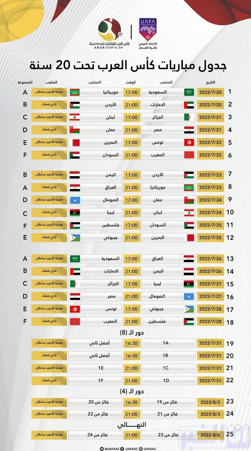 البرلنامج الكامل للبطولة العربية للمنتخاب أقل من 20 سنة