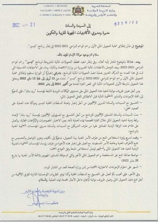 في بلاغ هام وعاجل، أعلنت وزارة التربية الوطنية والتعليم الأولي والرياضة قبل قليل عن إنطلاق عملية التحويل المالي الأول برسم الموسم الدراسي 2021 – 2022 في إطار برنامج تيسير ابتداء من 12 أبريل إلى غاية 12 ماي 2022، عبر مراسلة وجهتها إلى كافة مديري الأكاديميات الجهوية للتربية والتكوين.