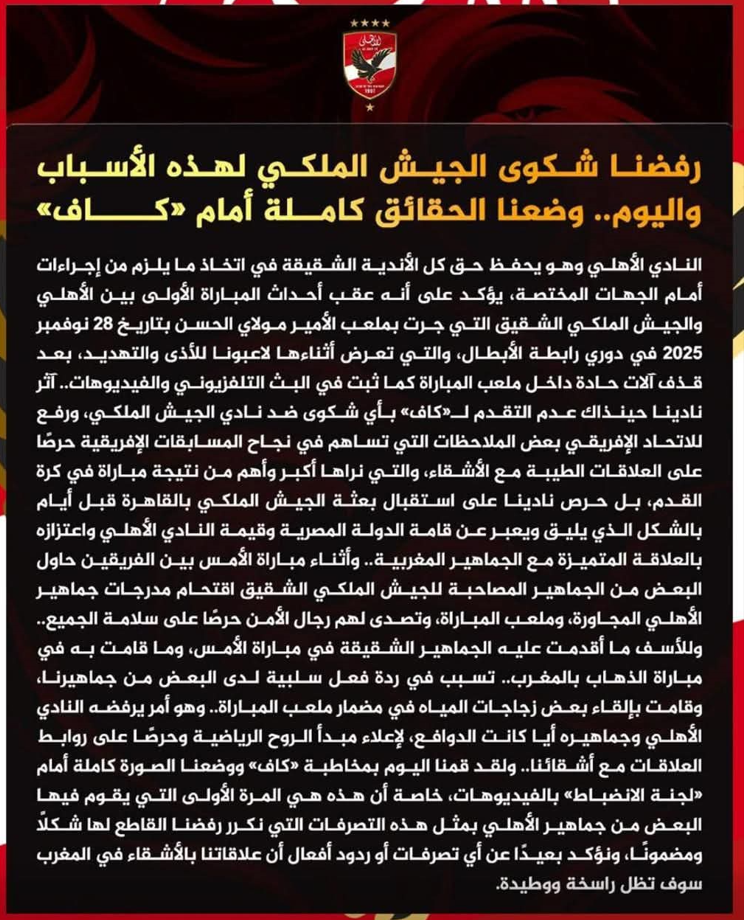 بيان الأهلي المصري يثير الجدل بعد أحداث مواجهة الجيش الملكي