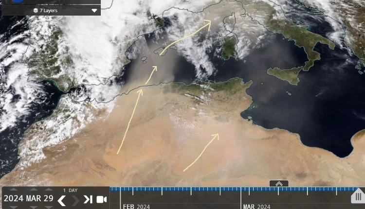 - تدفق الغبار الصحراوي: لا يزال جزء كبير من حوض البحر الأبيض المتوسط تحت تدفق الغبار الصحراوي.