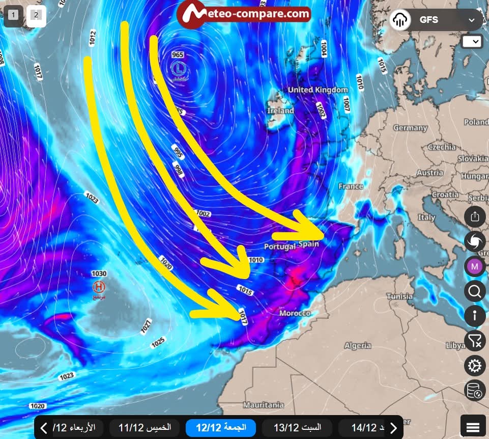 كما يظهر في أسفل الصورة، فإن التركيز حالياً ينصب على الفترة الممتدة من الخميس 12/12 والجمعة 13/12، وهي الأيام التي من المرجح أن تبدأ خلالها هذه الجبهة الجوية بالتأثير على الأجواء المغربية.