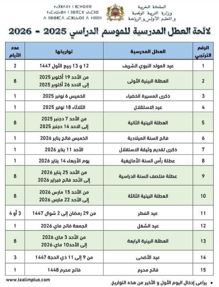 الموسم الدراسي 2025-2026 بالمغرب: أول عطلة مدرسية من 19 إلى 26 أكتوبر. لائحة العطل تشمل: عيد المولد، عطل بينية، ذكرى المسيرة الخضراء، عيد الاستقلال، فاتح يناير، ذكرى وثيقة الاستقلال، رأس السنة الأمازيغية، عطلة منتصف السنة، عيد الفطر، عيد الشغل، عيد الأضحى، فاتح محرم. تراعي اللائحة جميع الأسلاك التعليمية وتهدف لتحسين جودة التعلم والتوازن النفسي.