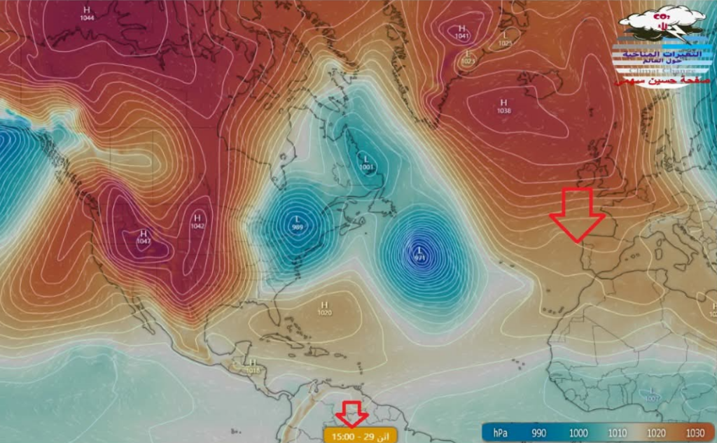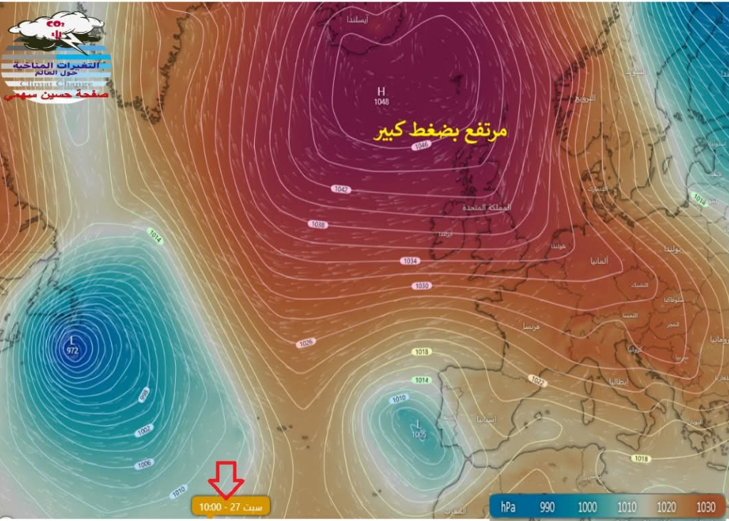 إذا نظرنا إلى الخريطة التي تظهر الضغط الجوي (اللون الأحمر والبنفسجي شمالاً)، نجد مرتفعاً جوياً “سيبيرياً” ضخماً يبسط سيطرته على أوروبا. هذا المرتفع يلعب دور “الحارس”، حيث يمنع المنخفضات من سلوك مسارها الطبيعي نحو الشمال، مما يجبر المنخفض الحالي (الذي نراه باللون الأزرق) على الانفصال عن تياراته الأم والارتماء في حضن السواحل المغربية.