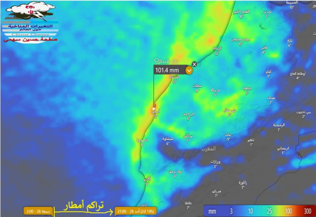 يوم السبت هو “يوم الذروة” بامتياز. حيث تتوقع الأرصاد تسجيل مقاييس هامة تتراوح بين 40 و60 ملم في مناطق: أكادير إيدا أو تنان، شتوكة آيت باها، إنزكان، تارودانت، تزنيت، الصويرة، الجديدة، وآسفي.
