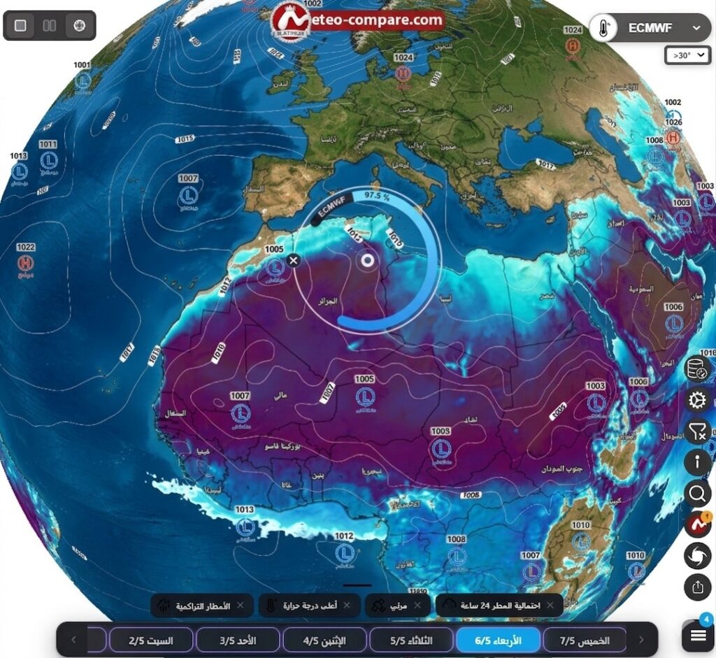 وفي الوقت الذي يستفيد فيه المغرب من هذا الانتعاش الأطلسي، ترصد الخريطة اندفاعاً قوياً لما يُعرف بـ” المرتفع الصحراوي” نحو الجهة الشرقية. وتوضح الألوان الداكنة على موقع meteo-compare تركيز كتلة هوائية شديدة الحرارة تنطلق من عمق الصحراء لتضرب مباشرة شرق الجزائر وتونس، مما سيجعل هذه المناطق تعيش أجواءً صيفية مبكرة، بينما يظل المغرب بمنأى عنها بفضل حماية المنخفض الجوي القادم من المحيط.
