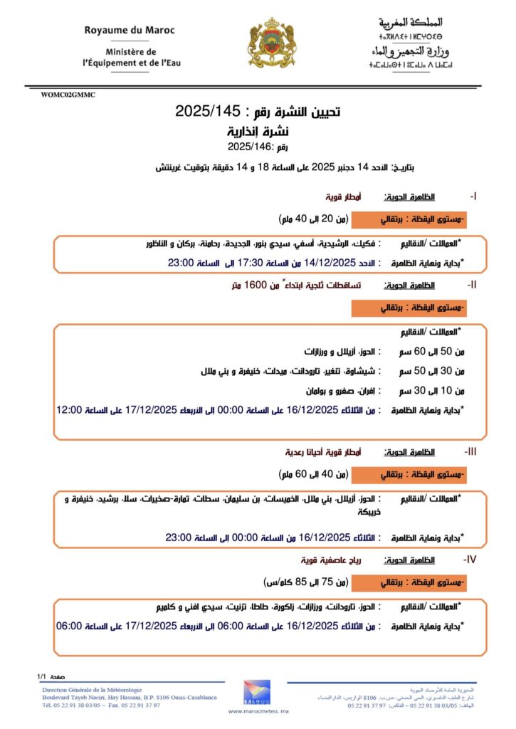 تفاعلاً مع التغيرات الجوية المتسارعة التي يعرفها طقس المغرب المملكة، أصدرت المديرية العامة للأرصاد الجوية نشرة إنذارية جديدة تحمل الرقم (2025/145)، تُحذر فيها من موجة طقس استثنائية تشمل أمطاراً رعدية قوية ورياحاً عاصفية، بالإضافة إلى تساقطات ثلجية كثيفة على المرتفعات.