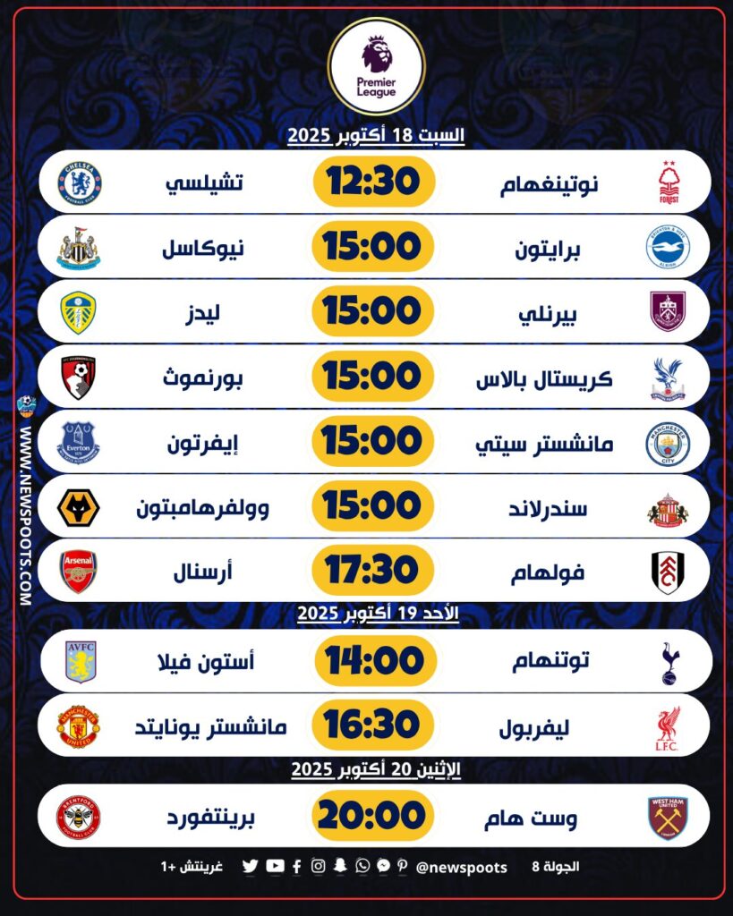 الدوري الإنجليزي جدول مباريات الجولة الثامنة (بتوقيت غرينتش +1)