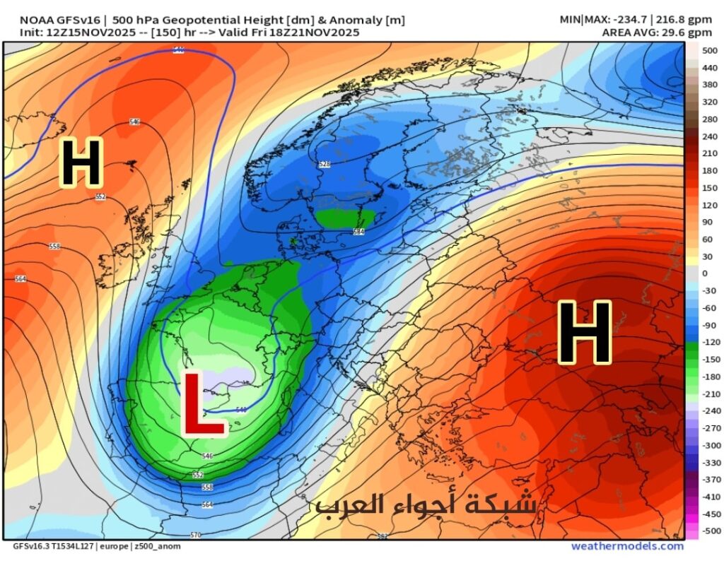 تكشف خرائط الطقس الفنية، وخاصة توقعات يوم الخميس 20 نوفمبر 2025 (في خريطة شذوذ الجهد الجغرافي عند 500 هكتوباسكال)، عن سيناريو جيد: