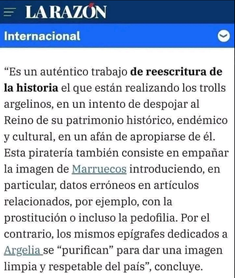 في تحقيق استقصائي نشرته صحيفة لاراثون الإسبانية، تم تسليط الضوء على مخطط استخباراتي ممنهج من جانب الجزائر يهدف إلى تحريف تاريخ المغرب وتشويه صورته على المنصات الرقمية، أبرزها ويكيبيديا. التقرير يؤكد أن هذه الحملة تشمل نشر معلومات زائفة عن تاريخ البلد، إلى جانب محاولة تشويه سمعته من خلال حملات إعلامية مشبوهة.