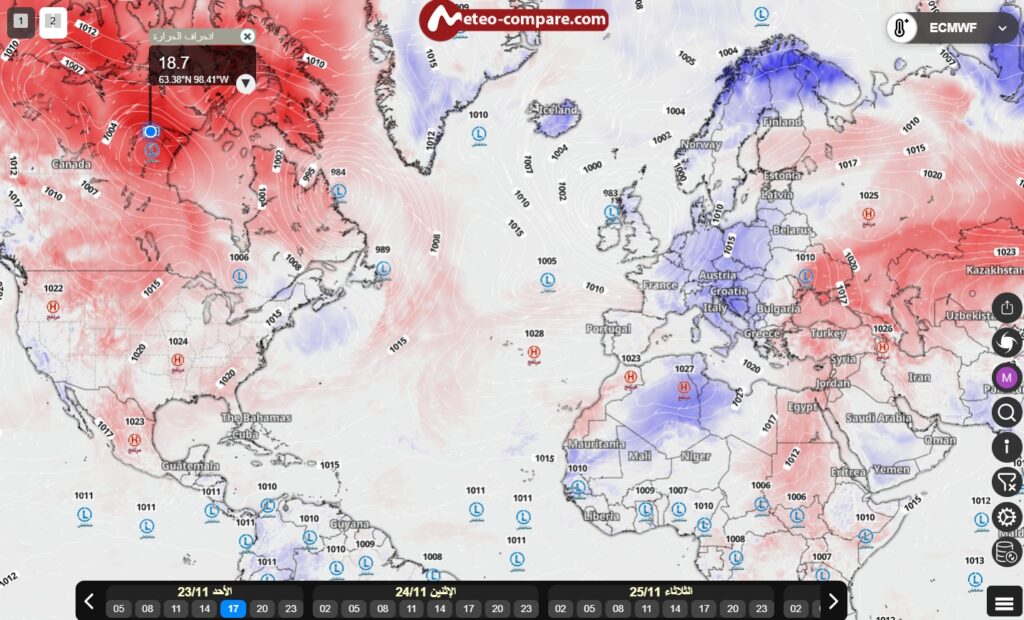 • القطب الشمالي في حالة “صيف مُبكر”: مناطق واسعة من شمال كندا وسيبيريا مغطاة باللون الأحمر الداكن، مسجلة درجات حرارة أعلى بكثير من معدلاتها (قد تتجاوز 18 درجة مئوية كما تشير بعض نقاط القياس)، وهو أمر مقلق للغاية.