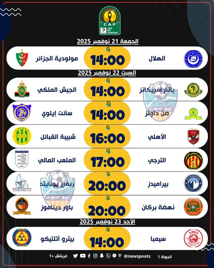 ينطلق دور المجموعات في دوري أبطال أفريقيا 2025 بالجولة الأولى. يقدم موقع "أنا الخبر" جدول المواعيد كاملاً بتوقيت غرينتش + 1: الجمعة 21 نوفمبر: مولودية الجزائر - الهلال. السبت 22 نوفمبر: الجيش الملكي - يانغ أفريكانز، سانت إيلوي - نيو سوت صن داونز، شبيبة القبائل - الأهلي، الملعب المالي - الترجي، ريفرز يونايتد - بيراميدز، باور ديناموز - نهضة بركان. الأحد 23 نوفمبر: بيترو أتلتيكو - سيمبا.