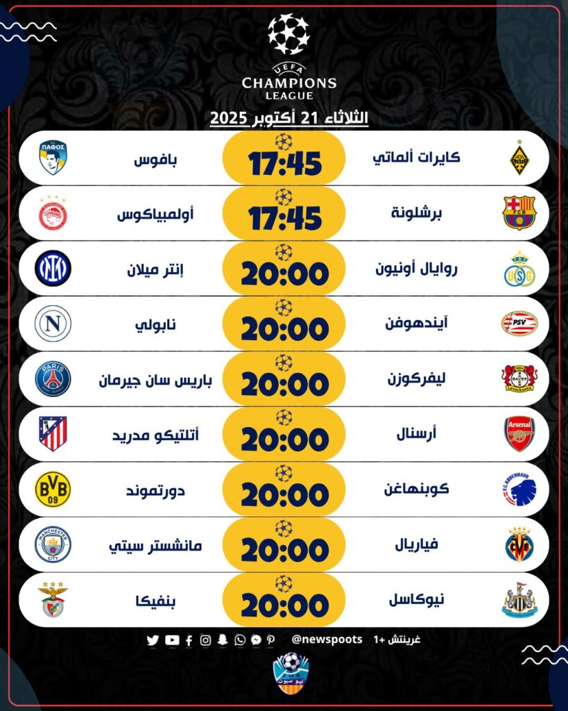 تنطلق الجولة الثالثة من دوري أبطال أوروبا (الثلاثاء 21 أكتوبر 2025) بـ 8 مباريات قوية. تبدأ المباريات في 17:45 و 20:00 بتوقيت غرينيتش (GMT). تشمل المباريات: كايزرسلاوترن vs. بافوس، برشلونة vs. أولمبياكوس، رويال أونيون vs. إنتر ميلان، آيندهوفن vs. نابولي، باير ليفركوزن vs. باريس سان جيرمان، أرسنال vs. أتلتيكو مدريد، كوبنهاجن vs. دورتموند، فياريال vs. مانشستر سيتي، نيوكاسل vs. بنفيكا.