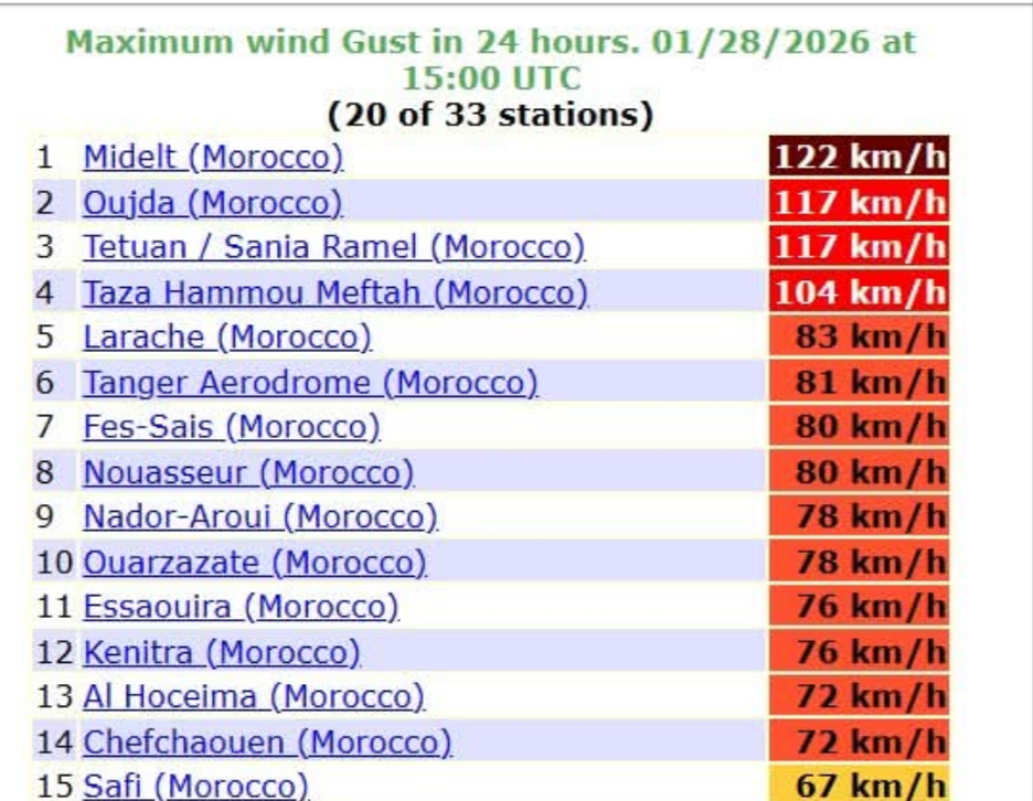 وعلى الجانب المغربي، لم تكن الأجواء أقل حدة، حيث عاشت مدينة ميدلت يوماً عاصفاً بامتياز بعد أن سجلت هبات رياح بلغت قوتها 122 كيلومتراً في الساعة، وهي القيمة الأعلى وطنياً لهذا اليوم.