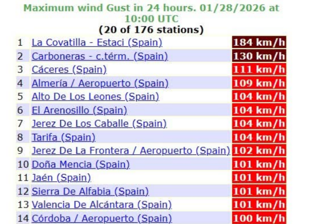 ففي الجارة إسبانيا، وصلت قوة العواصف إلى ذروتها في منطقة “لا كوفاتيلا”، حيث بلغت سرعة هبات الرياح 184 كيلومتراً في الساعة، وهي سرعة تندرج ضمن تصنيفات الرياح التدميرية التي قذ تسبب أضراراً جسيمة في البنية التحتية والممتلكات.