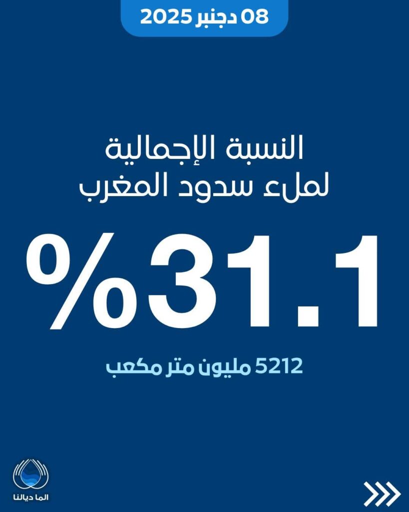 بلغت النسبة الإجمالية لملء سدود المغرب حتى يوم الإثنين 08 دجنبر 2025 حوالي 31.1%، بإجمالي موارد مائية مُخزّنة يناهز 5212 مليون متر مكعب (م³)*.