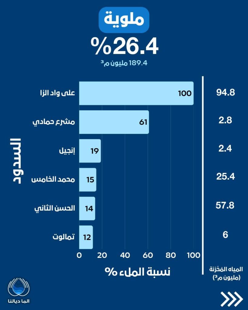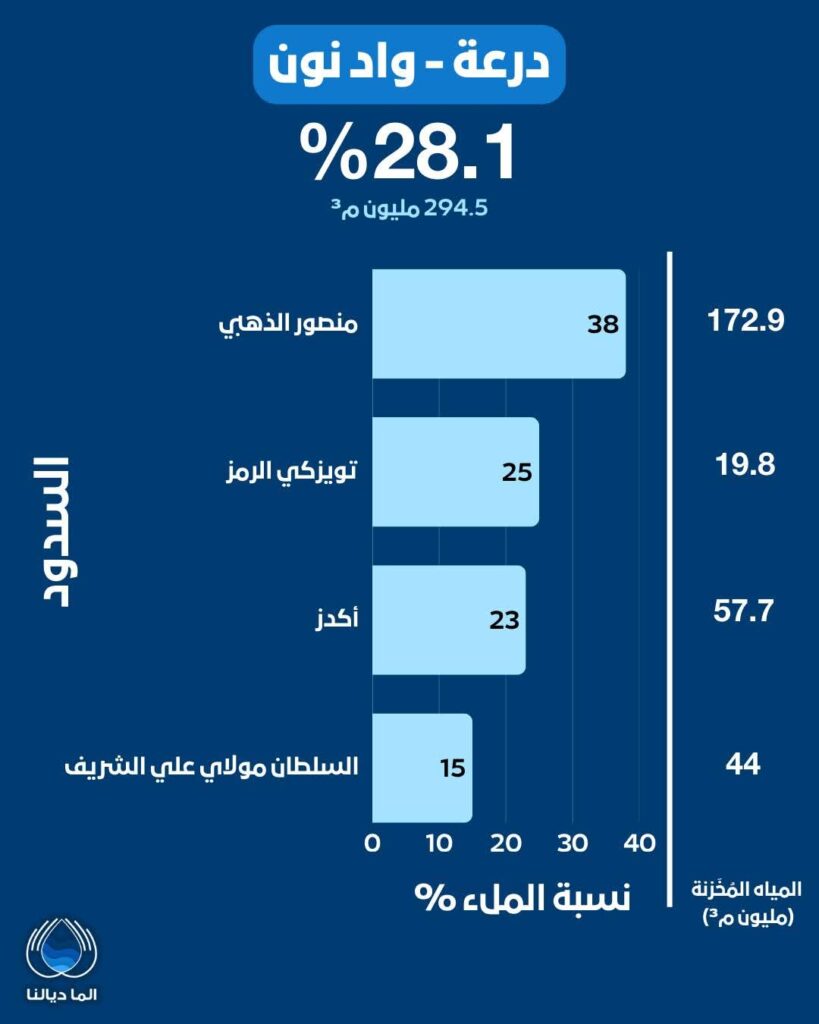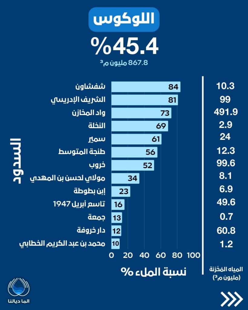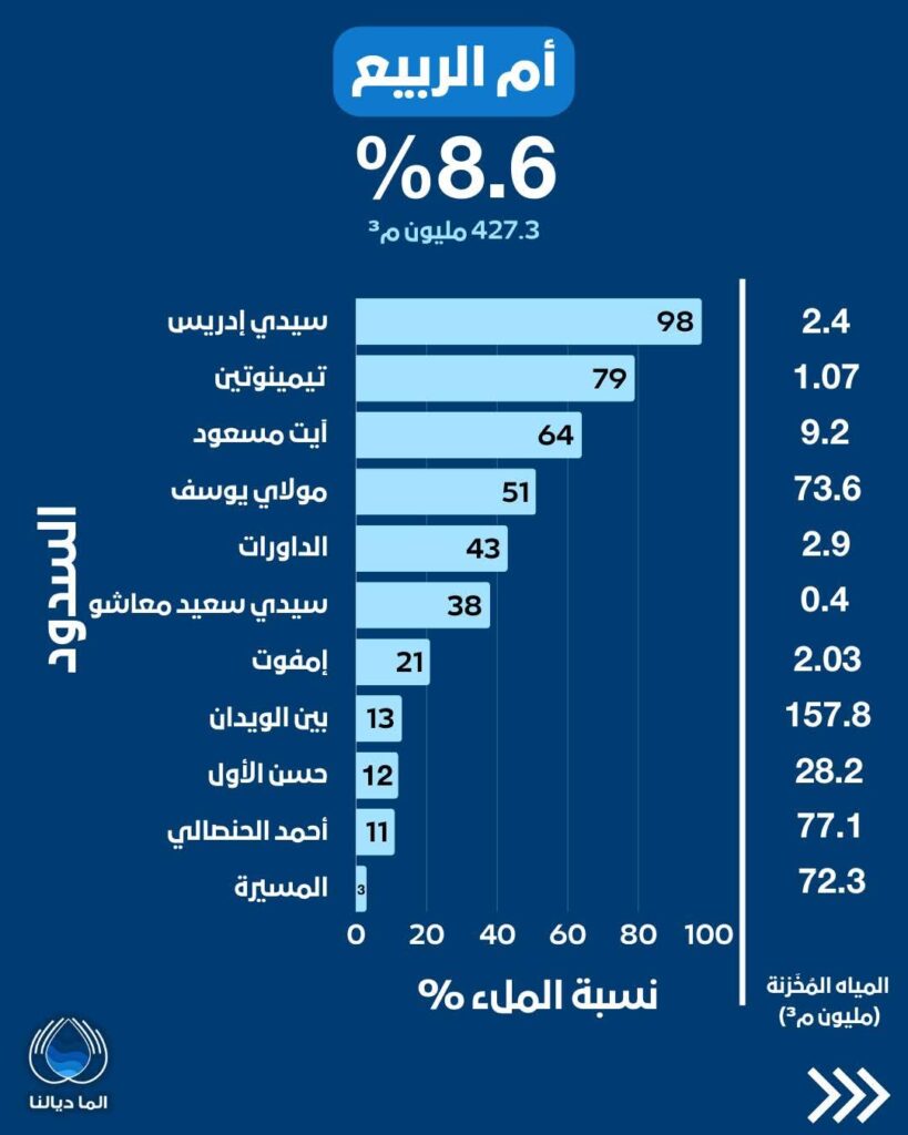 - أم الربيع (8.6%): يسجل أدنى نسبة ملء إجمالية، حيث بلغت نسبة سد المسيرة، أحد أكبر السدود، 3% فقط بمخزون 72.3 مليون م³.