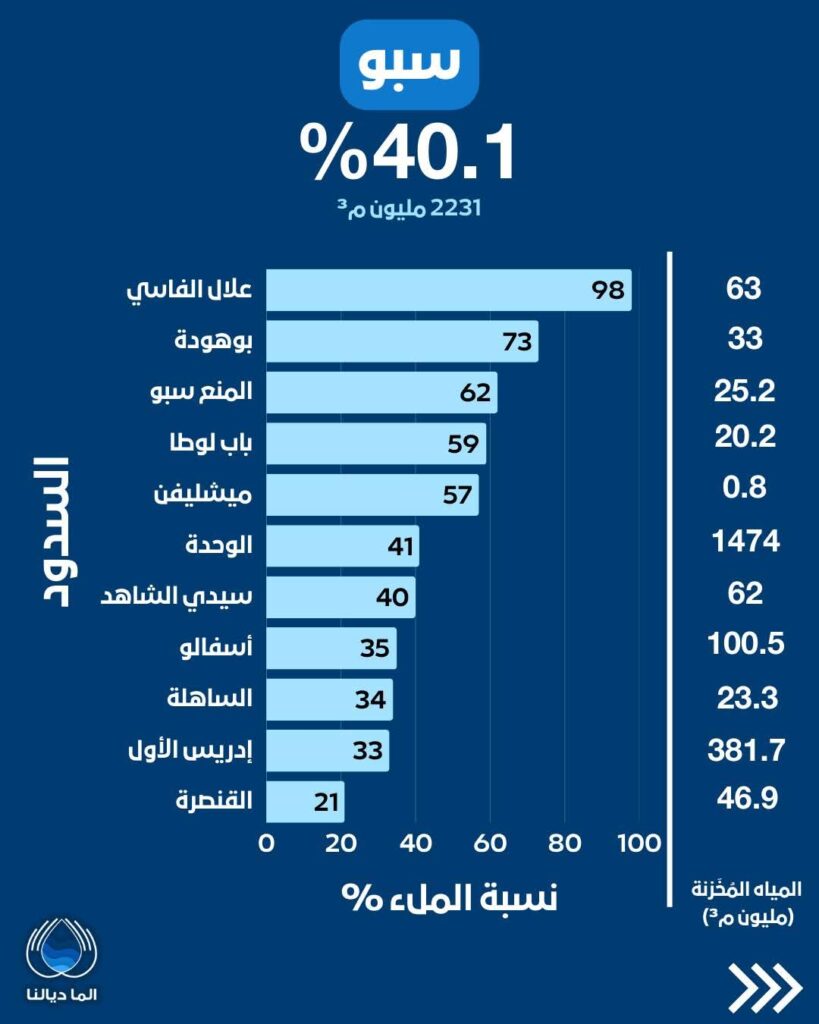 - سد الوحدة (حوض سبو): لا يزال هو السد صاحب أكبر مخزون مائي على الصعيد الوطني، حيث يخزن 1474 مليون م³ بنسبة ملء 41%.