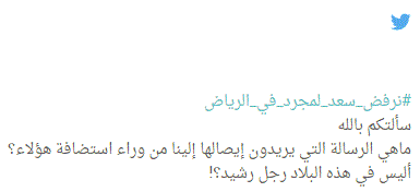 هاشتاغ “نرفض سعد لجرد في الرياض” انتشر بسرعة منذ أمس الاثنين بمجرد إعلان موعد الحفل الذي سيشارك فيه المغني المغربي رفقة ميريام فارس وفرقة ميامي، إذ ذكر عدد من المغردين في توتير وعلى الفايسبوك بماضي المغني مع قضايا التحرش الجنسي، وهو ما اعتبروه سببا مقنعا لعدم الدعية له واستقباله.