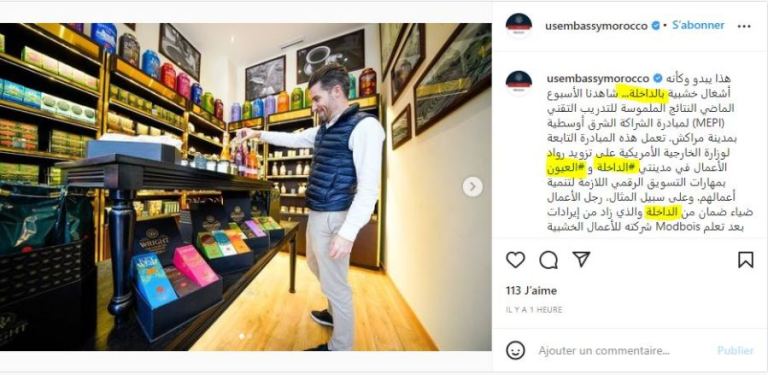 ففي أحد مقتطفات المنشور المشار إليه نجده يتحدث عن “النتائج الملموسة للتدريب التقني لمبادرة الشراكة الشرق أوسطية (mepi) بمدينة مراكش”، وأن ” هذه المبادرة التابعة لوزارة الخارجية الأمريكية تعمل على تزويد رواد الأعمال في مدينتي الداخلة والعيون بمهارات التسويق الرقمي اللازمة لتنمية أعمالهم”، في إشارة واضحة لمغربية المدينتين وذلك بربطهما بمشروع يشمل كل التراب الوطني.